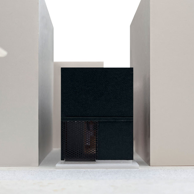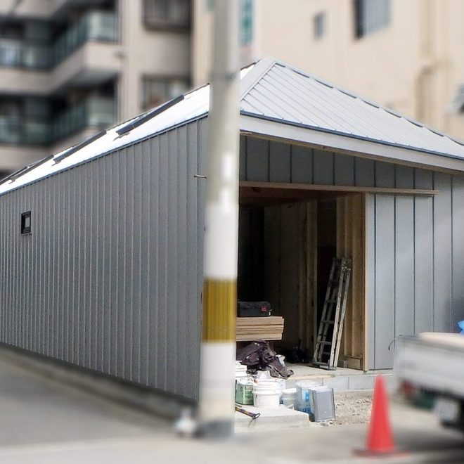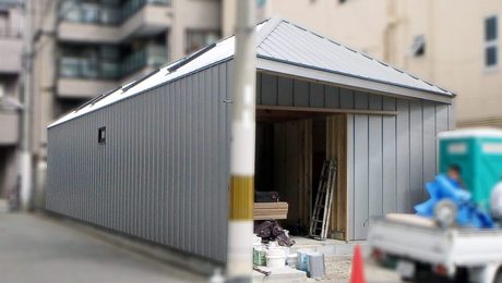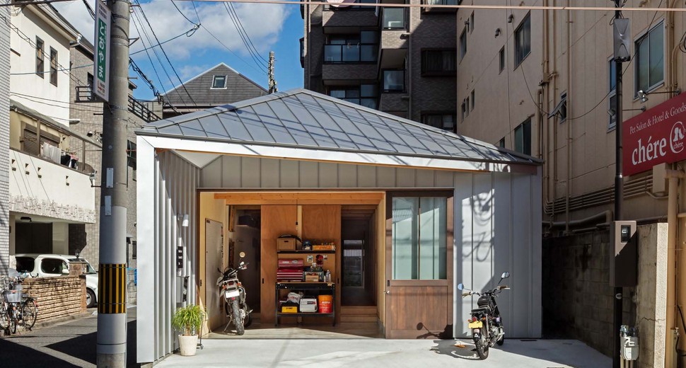 再開発の進む下町に計画した細長い平屋です。ご夫婦のダイニングキッチン・寝室・水周り、お母様の寝室、事務所・打合せ室・倉庫といった盛りだくさんのご希望を、職住・公私の距離や複雑な動線を整理しながら、1.4mピッチに組んだ骨組みの中にコンパクトに詰め込みました。三角屋根に設けたトップライトから主な採光を取り、市街地でも静かでぼんやり明るい内部空間となっています。低層の細長い箱に三角屋根を架け、更にそれらをシルバーのガルバリウム鋼板で包んだ外観は、住宅なのか事務所なのか倉庫なのか、一見はっきり分かりません。職住遊が一体となったお施主様の暮らしや大阪の下町の街並みによく馴染む建築になればと考えました。