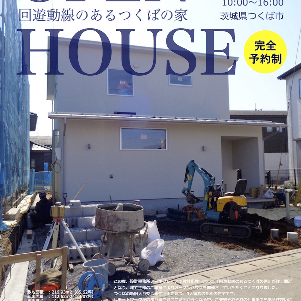 この度、設計事務所アーキプレイスで設計監理しました『回遊動線のあるつくばの家』が竣工間近となり、建て主様のご厚意によりオープンハウスを開催させていただくことになりました。