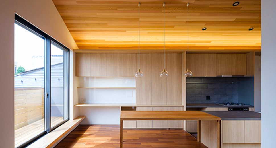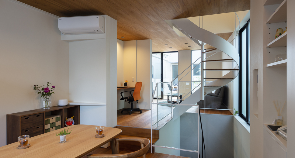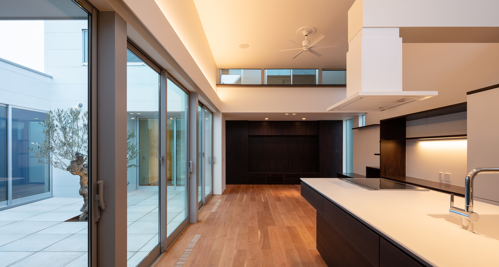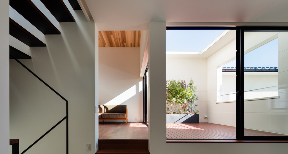 LDKの外には壁で囲んだテラスを設け、空からの光と風を室内に取り込んでいます。テラスは室内に開放感と落ち着きをもたらすと共に、密集地に建つ住宅と自然をつなぎ、日々の暮らしに四季の変化を届けます。