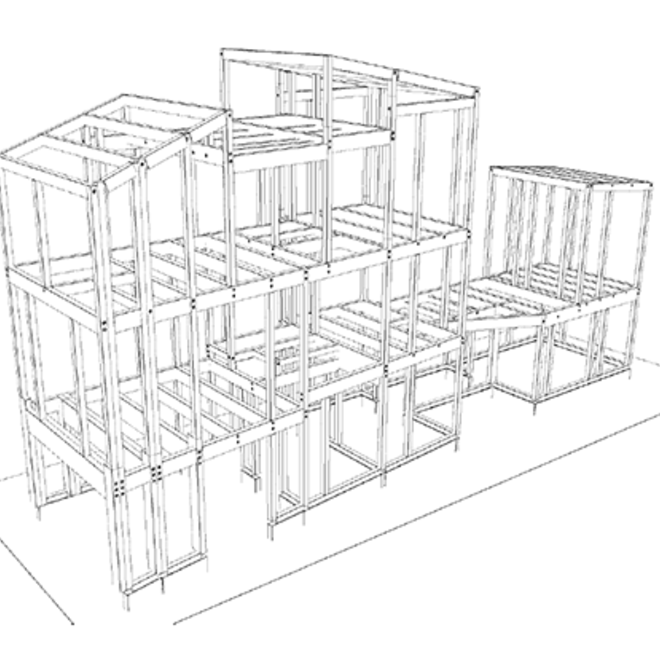 敷地の高低差を利用して、道路に面した場所に半地下の賃貸住戸をつくり、その上に木造を2層のせ、地下1階地上2階建ての準耐火構造の共同住宅+長屋として計画。建ぺい率や高さ制限をクリアさせ、準防火地域の建ぺい率10%緩和、建ぺい率住宅地下の容積率不算入の緩和なども使って最大限の容積を確保しました。オーナー住戸は、外部空間との繋がりをもたせながら、南東側の広がりと眺望を取り込むように計画した、完全分離型の二世帯住宅になっています。
