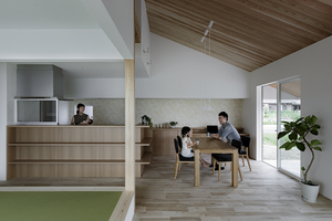片流れの屋根を室内のデザインに活かした創造的なリビング。天井に勾配があることで部屋に方向性を作り出し、高さの異なる壁を立体的に使うことで空間に躍動感を生み出しています。少しでも天井を高くするための方法...2018/02/19 up date!
