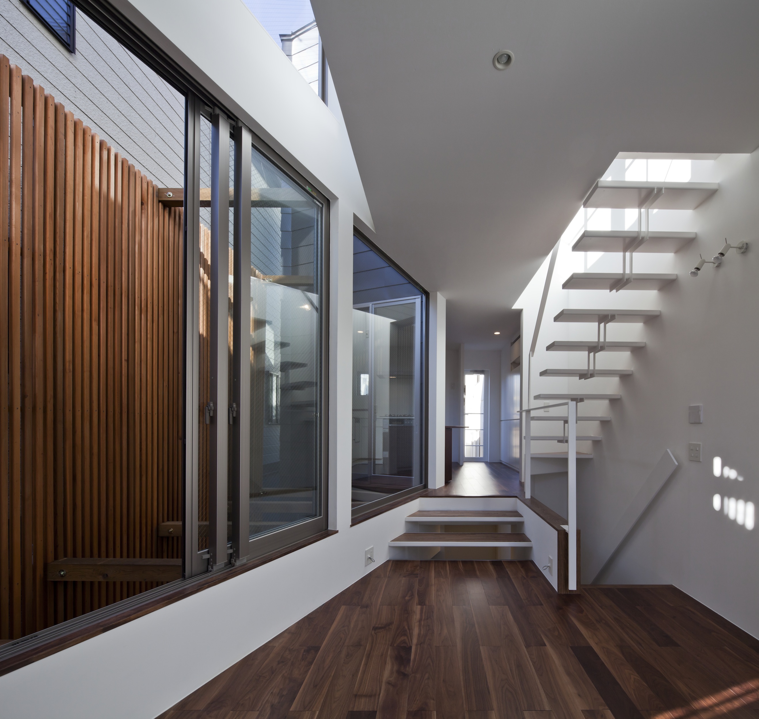冒頭の、光あふれる明るい室内写真。実は、細い路地の奥に建つ、こんなにコンパクトな住宅です。小さな家の内部がこれほど広々として見える理由は、スキップフロア、大きな窓、スケルトン階段や吹き抜けなど、ここでご紹介した「狭小住宅を広く見せる工夫」をフル活用しているから。敷地が狭くても、隣家に挟まれた窮屈な立地でも、アイデア次第でのびのびと快適に暮らすことができる好例です。