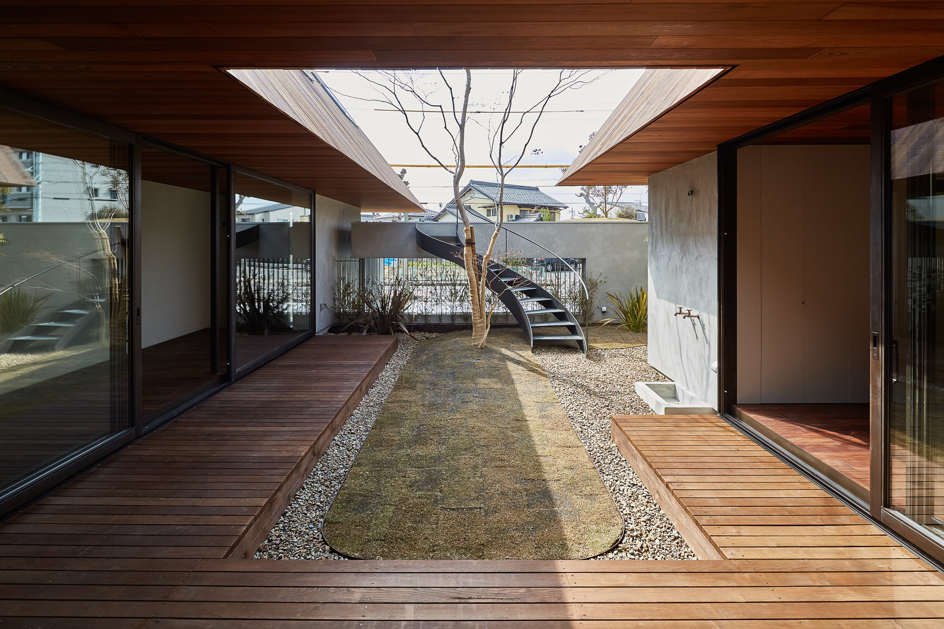 中庭をぐるりと囲む大きなデッキ。各部屋と続いているので、どこからもデッキと中庭を楽しめます。