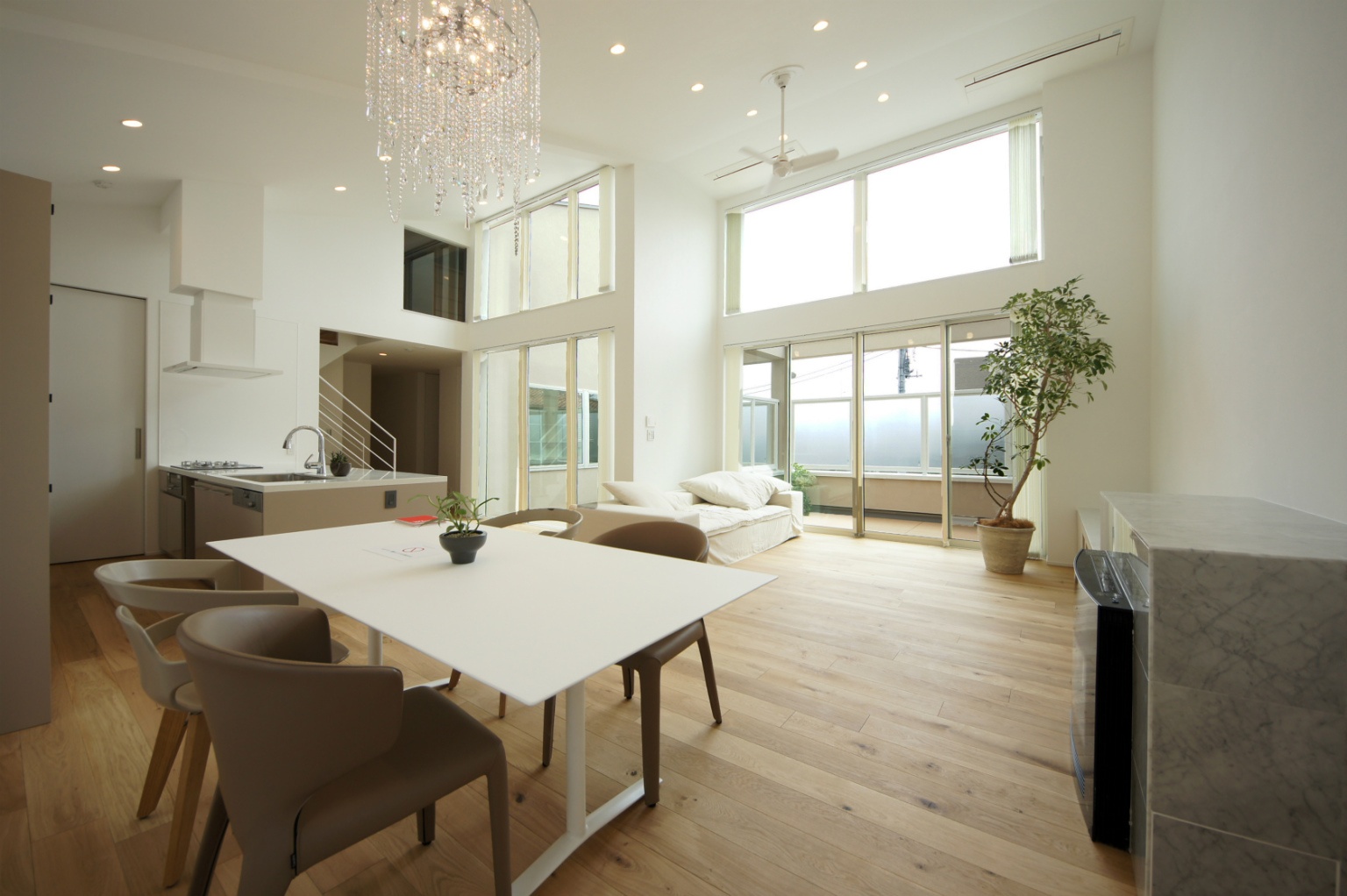 2層分の天井高、天井までの大開口を持つ大空間のLDK。圧巻の一言ですね。大きな観葉植物と存在感のある照明もこれだけの大空間だからこそマッチしています。この空間にまたぴったりとフィットしているのが、モダンなタイプの暖炉です。これなら、この空間にも違和感ありませんね。モダンな空間がお好みのあなたにお勧めの暖炉です。