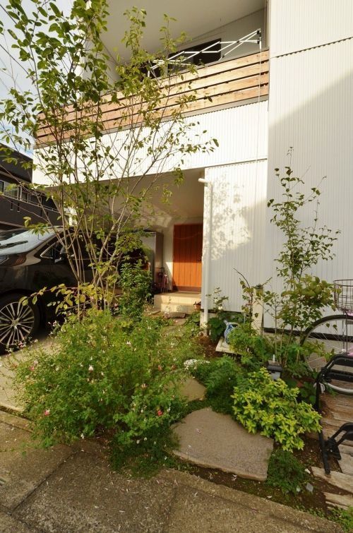 奥の玄関に行くまでには、たくさんの植物が出迎えてくれます。石畳とグリーンが、アプローチ全体を柔和な印象へと導きます。
