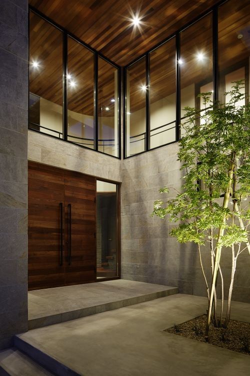 打ちっぱなしのコンクリートと植栽、そして間接照明が、大人の味わい深い空間を演出しています。