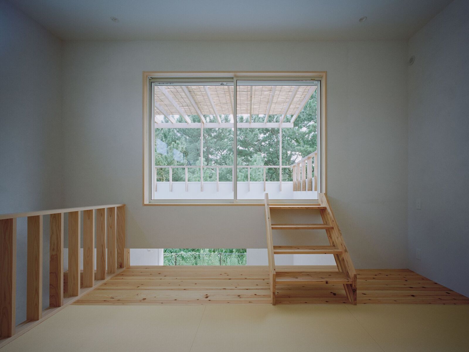 最上階から、ルーフバルコニーへ出る空間。スキップフロアであることによって、空間にリズム感を演出しています。優しい白木と白い壁、外に見える木の緑。ここから目に入るものが全て計算されて、この空間になったんだろうなと思わせる眺めですね。