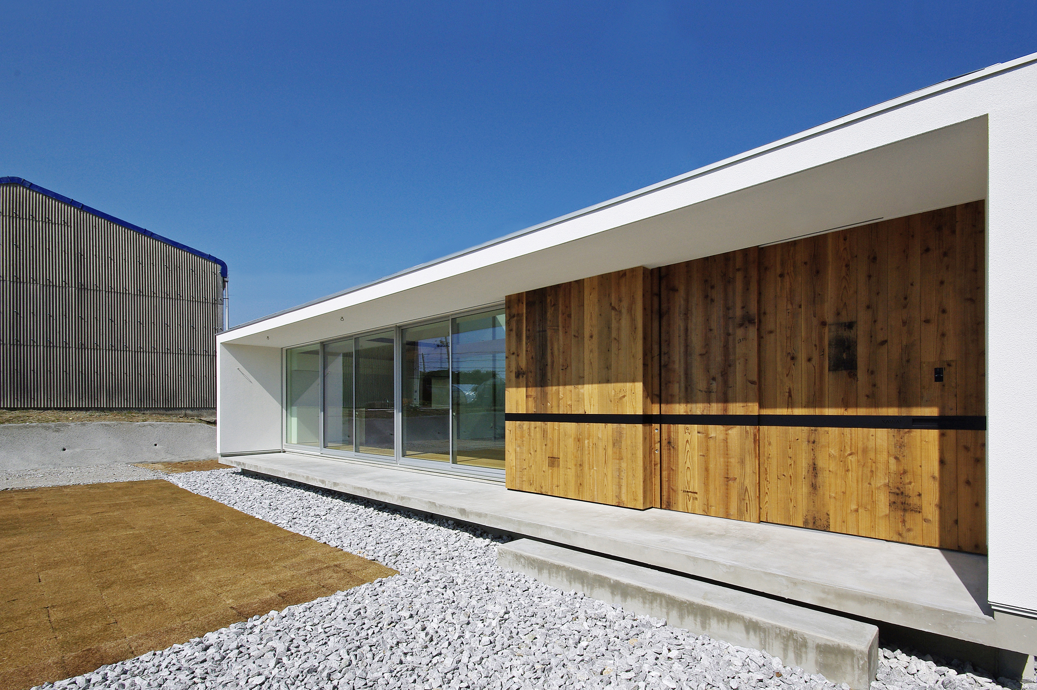 白とガラスと木で構成された外観。ただもう、美しいです。シャープさの中に、木の温もりも感じられる優しい表情。これだけスッキリとしているのは、やはり平屋だからでしょうか。敷地前面が大きく空いているのも好印象です。