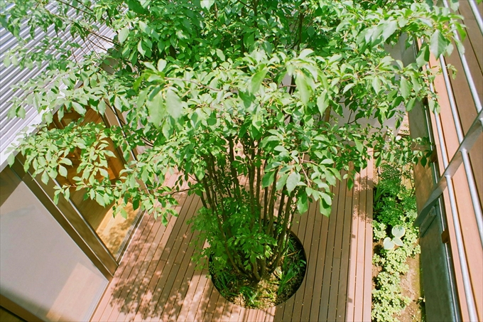 ウッドデッキの中央部をくりぬき、シンボルツリーを植えた中庭です。