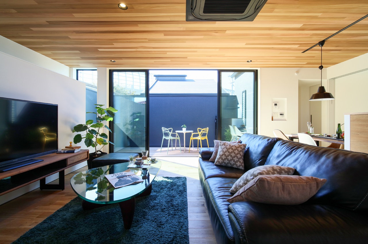 木質感たっぷりで、温かみのある空間を、シックな家具が引き締めています。窓枠も黒で統一感もあります。LDKでくつろげるのはもちろん、その奥のテラスでは明るい自然光を感じながら居心地の良い時間を過ごせるでしょう。
