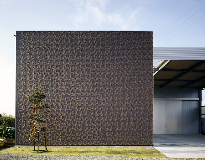 外壁の素材とデザインがとても特徴的です。思わず近寄って触りたくなるような色、質感ですね。前面がシンプルな芝生なだけに、個性的な壁とシンボルツリーがアート作品のように見えます。