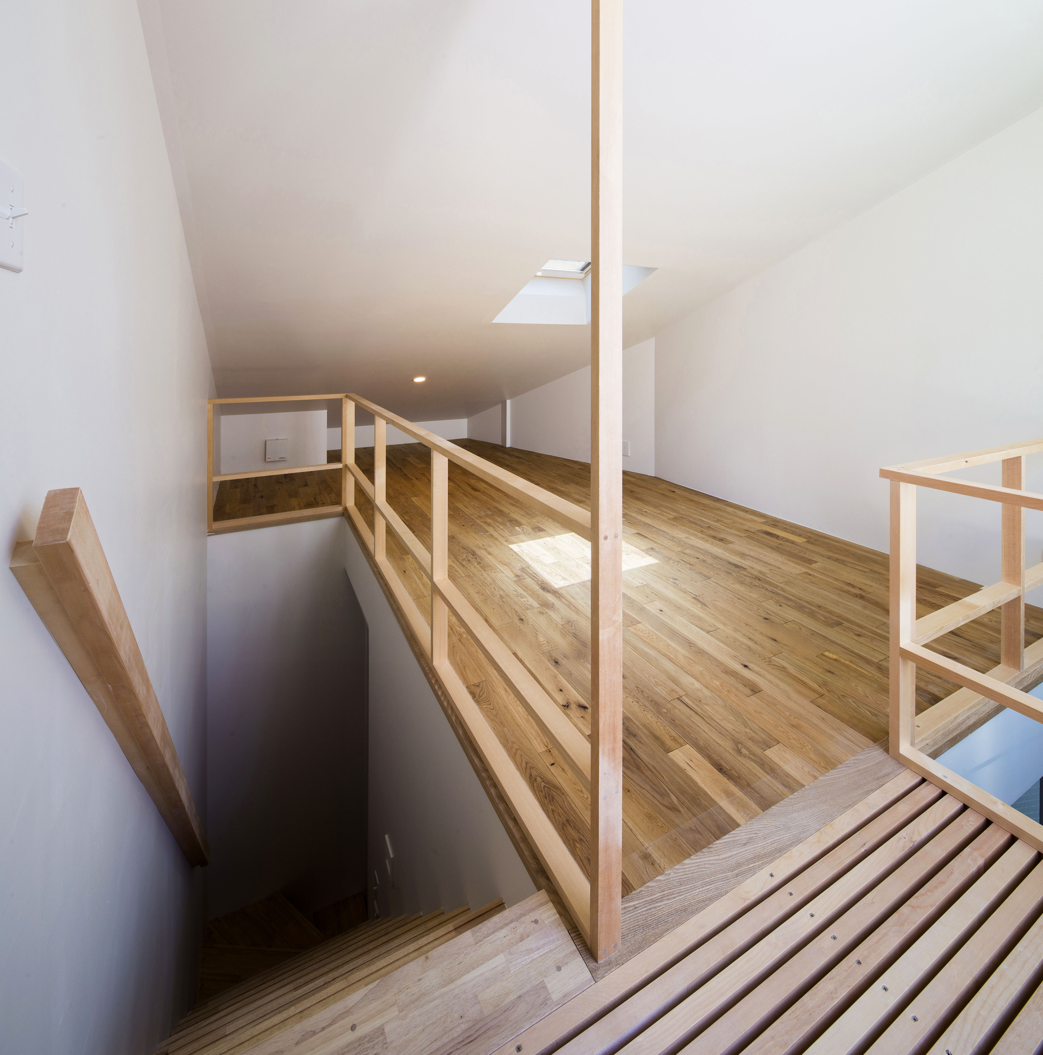 狭小住宅の最上階は、このロフト。屋根形状に合わせて、空間を存分に利用できるようになっています。バルコニーに通じる大きな開口部があるので、明るさも十分です。