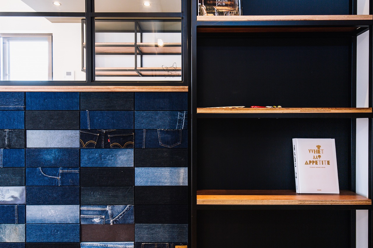 デニム地タイルをランダムに配置した無造作感がなんともいえないかっこよさ。
