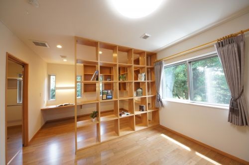 書斎兼寝室に取り付けられた本棚は、書斎と寝室の境目となる間仕切りとしても使われています。