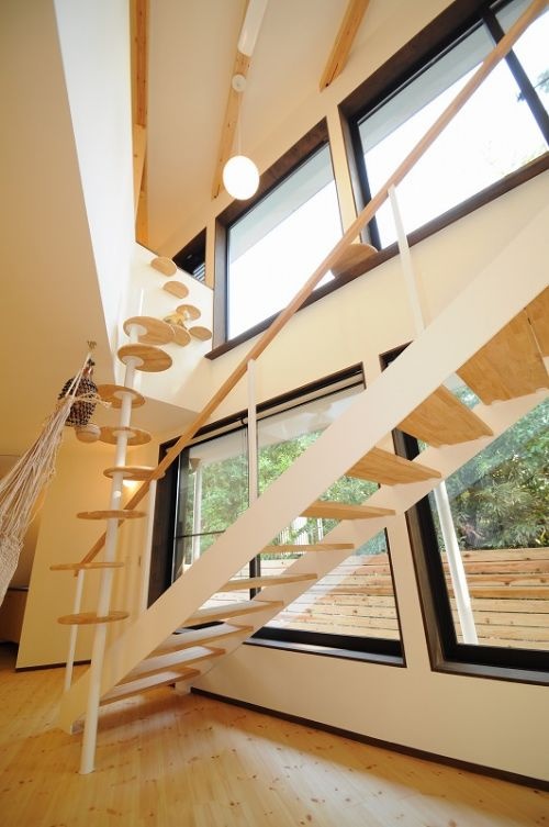 外からの明るい光が差す吹抜けには、壁側にはキャットタワーと猫階段、そして人間と犬用の階段が。