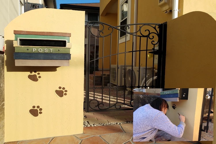 エントランスの塀には、“ペットの豆柴君がうっかり歩いちゃった跡”のような肉球型スタンプが! 自然と笑みがこぼれそうです。この肉球型スタンプは、駐車場の地面にもたくさん押しました。