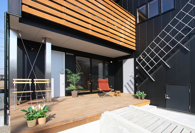 エントランスそのものをウッドデッキにしたご自宅。広いスペースが開放感を与えます。