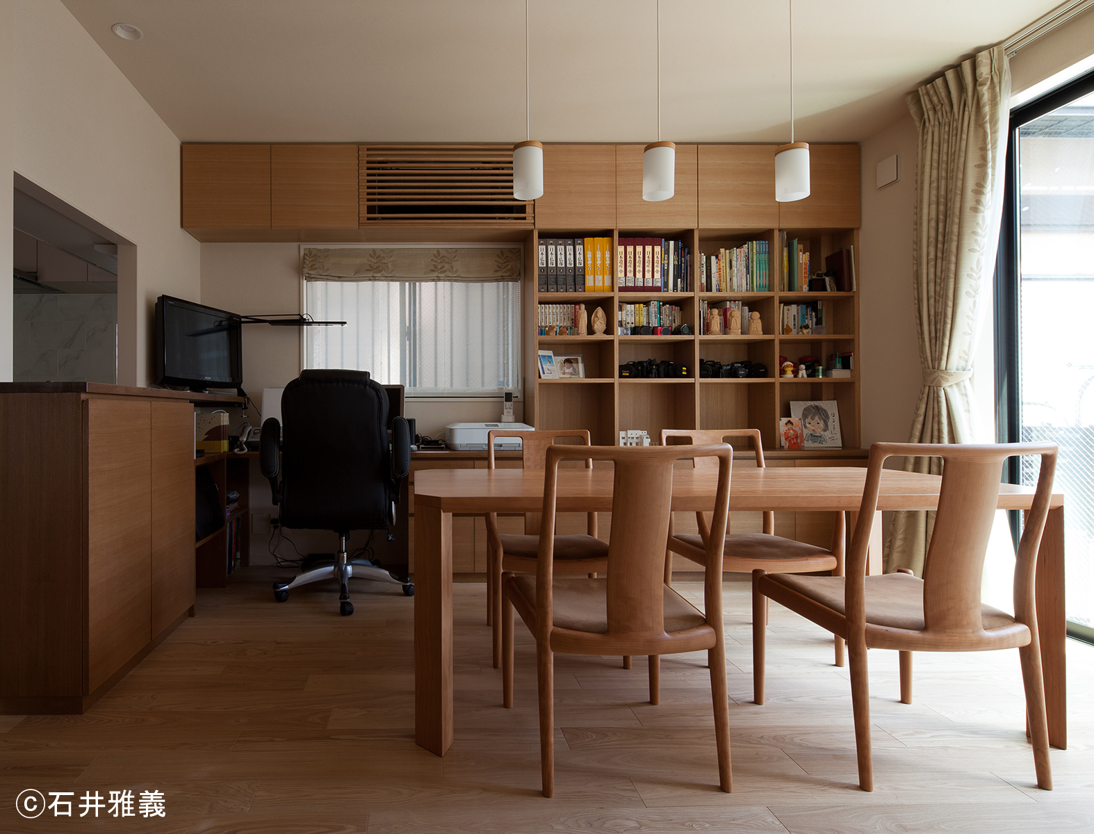 広い窓からは中庭が臨める、家族共有の書斎です。