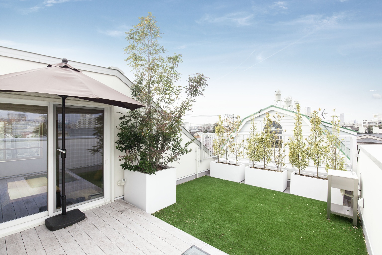 自宅最上階の屋上テラスから眺める都心の眺めは最高! 芝生とウッドデッキに分かれた空間は、それぞれの楽しみ方が叶います。