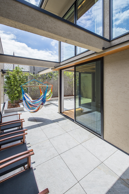椅子を4つにハンモックが2つ、そして鮮やかなグリーンを植えた空間は、まるで公園を凝縮したかのようです。