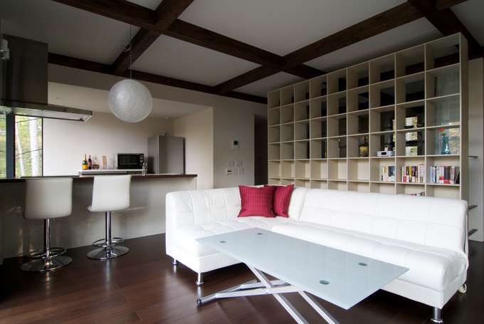 いくらあっても困らない収納と空間の間仕切りを融合させた、インテリアセンスを感じる間仕切り活用例です。