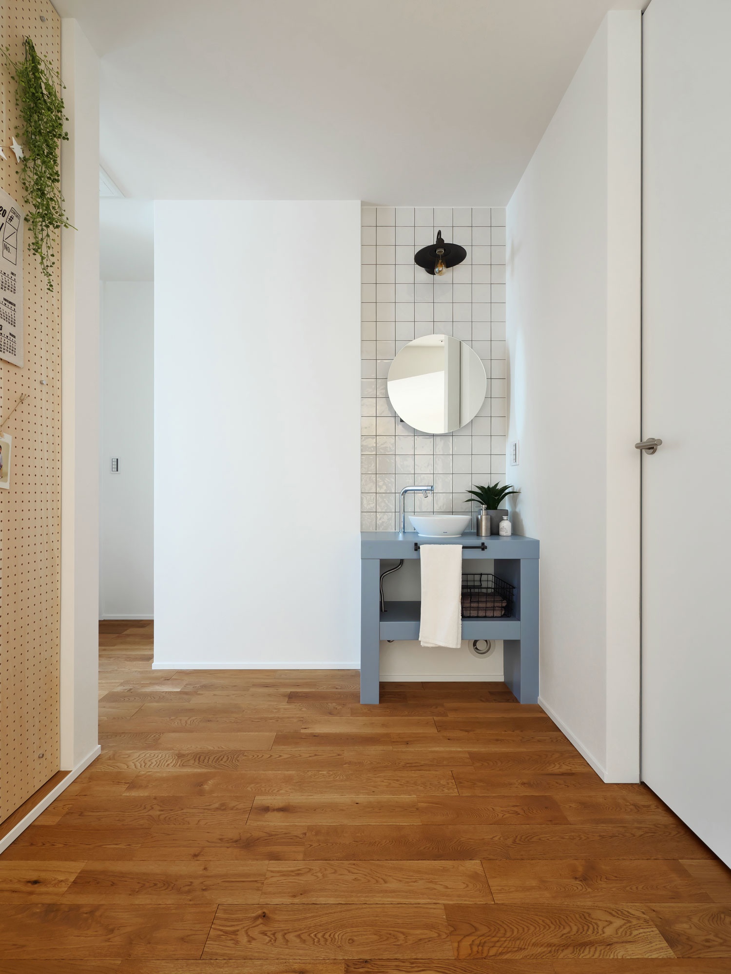 白いタイルにブルーグレイの洗面台。このおしゃれ感、たまりません。