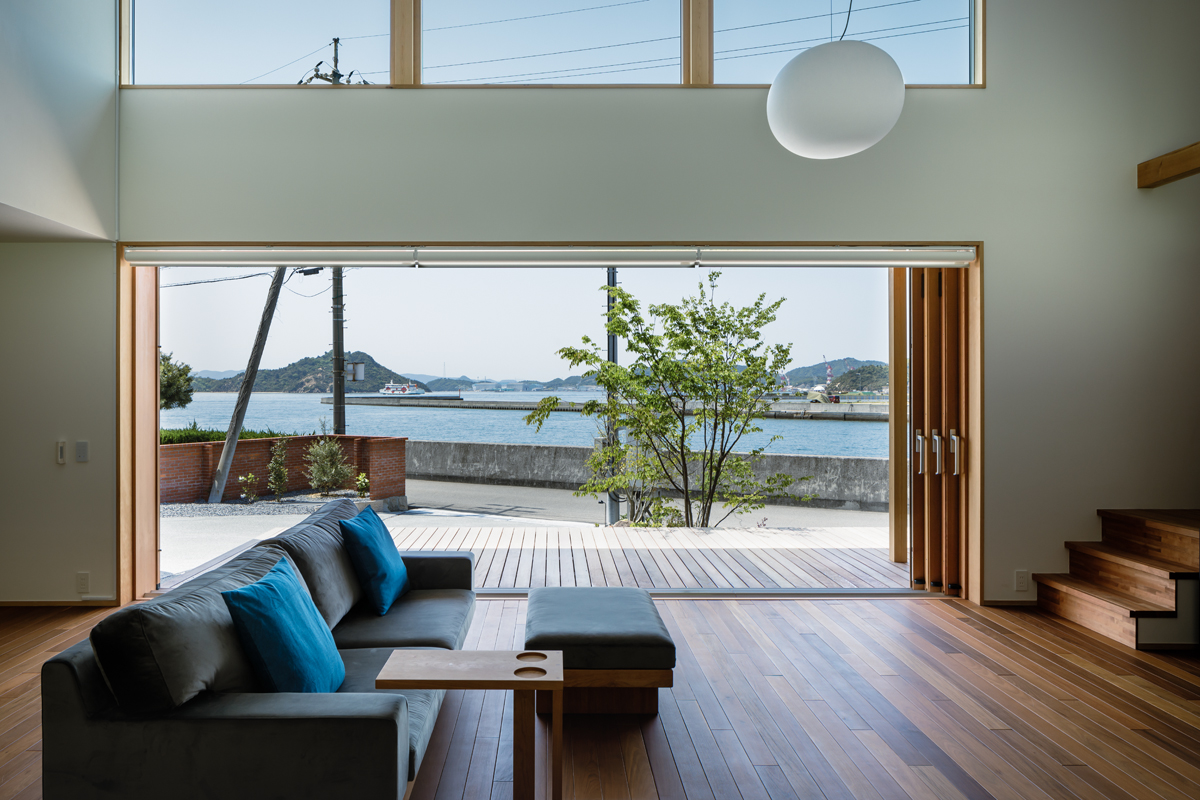 窓を開け放した先には大海原が。屋内がアウトサイドリビングとして楽しめる空間となります。