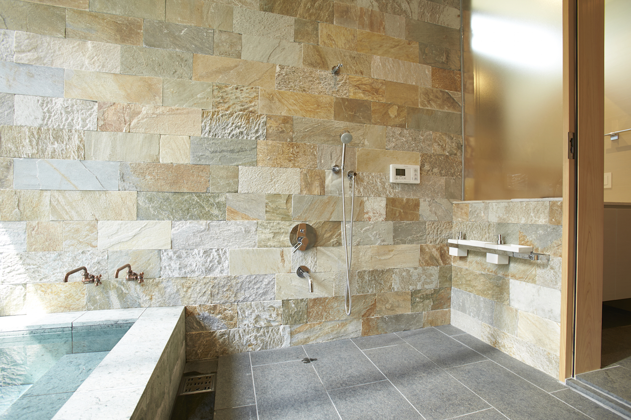 明るく温かみのある石張りにほっこりしつつ、浴槽は伊豆石を採用。