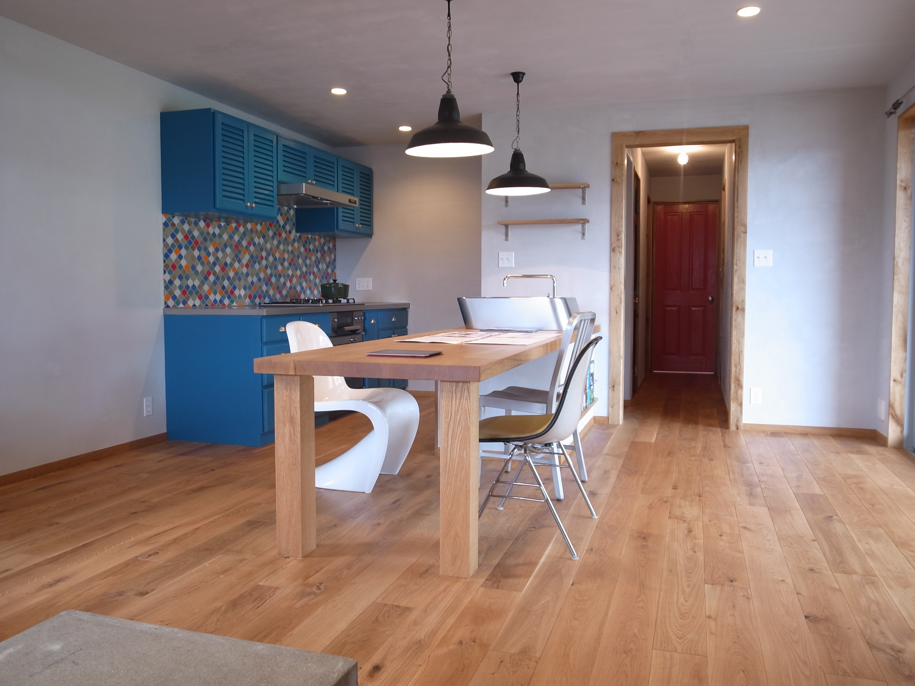 他をナチュラル感のあるもので合わせている分、キッチンのレトロポップなブルーカラーと色とりどりのタイルが際立ちます。