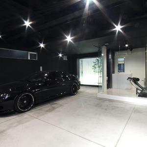 白で統一された空間に、天井窓と間接照明が映えるスタイリッシュなガレージです。