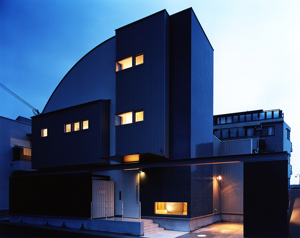 R形状の屋根や入り組んだ構造は、まるで商業施設のよう。 特に印象的なのは、 正面にある大きな吹き抜けに並ぶ横4本ライン。玄関から繋がる吹き抜け部分の明かりが、そのスリットの間から放たれるさまは、とても壮大な印象です。室内から見てみると、この吹き抜けには、裏庭に繋がる入り口や、二階に上がる階段、バルコニーに出られる通路などがあり、 風も光も通る空間になっています。また、一階の洗面室の天井にあるL型のハイサイウインドウは、形状が個性的なだけでなく、昼は明るい光を取り入れ、夜は印象的な外観をもたらしています。外観も内部もこの上なく洗練された住まいです。