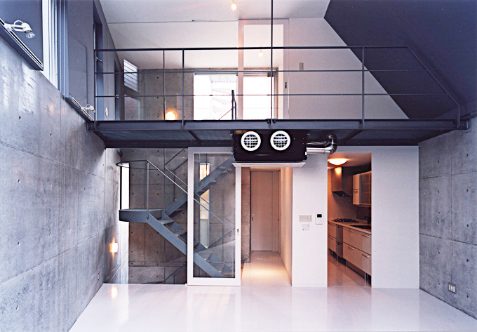 こちらは玄関を開けた瞬間に鉄骨の螺旋階段が目に飛び込んできます。