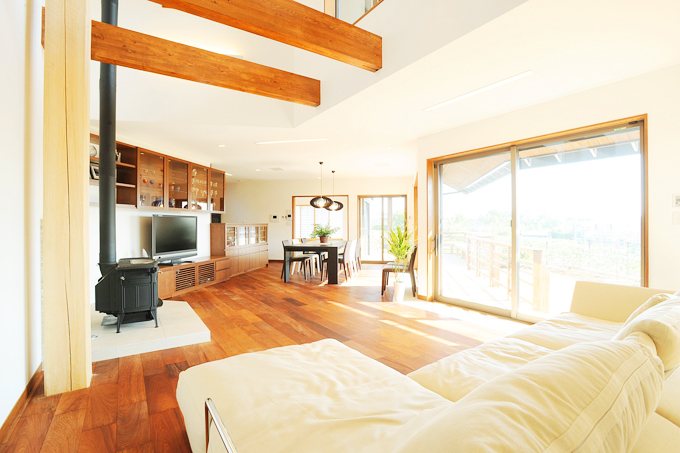 床段差をなくしたテラスとサッシをオープンにしていること、北米から輸入の木材レッドシダーをテラスの仕上げに使い、リビングの床が杉無垢フローリングになっていることでナチュラルで開放感のあるリビングとなっています。