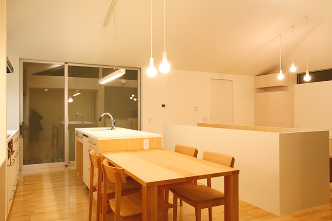 このダイニングでは、フリルのような特徴のある照明を用いる事で食卓の周りを華やかに演出していて、色とは違ったアプローチで食卓を明るい空間に仕立てています。