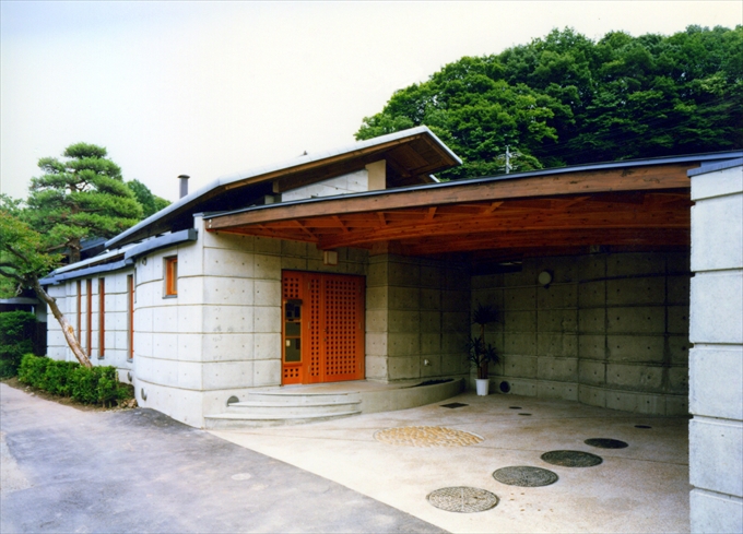 こちらのモノトーンでシックな住宅では、玄関の前にワンボックスカーを停められるだけのスペースを確保しています。住宅の2階のテラスがガレージの屋根になっており、省スペースでガレージを確保しています。ワンボックスカーでアウトドアを楽しみ、釣って帰った魚を調理して2階のテラスで楽しむといった使い方ができますよ。