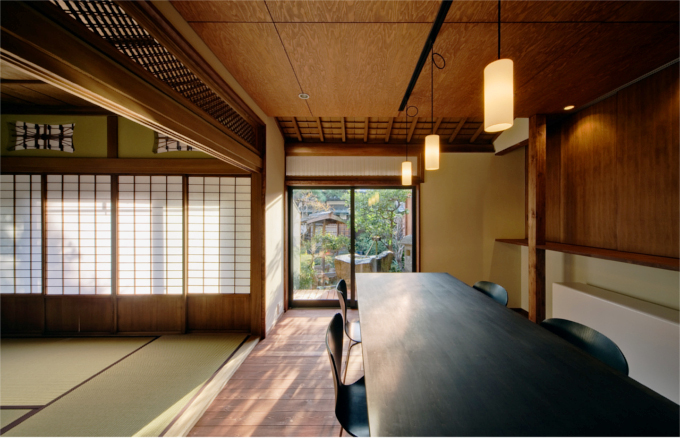 明治時代に建てられた旧家のリノベーション。明治時代から、日本の歴史を静かに見守ってきた家。そこに新たな現代の風が吹き抜けます。座敷の一部分を、三世代が集えるダイニングへと改修しました。ダイニングテーブルの横には、障子と畳という、古き良き時代の和室空間が広がりますが、不思議とテーブルがマッチします。これぞ和モダン。新と旧が織りなす合わせ技がキラリと光ります。