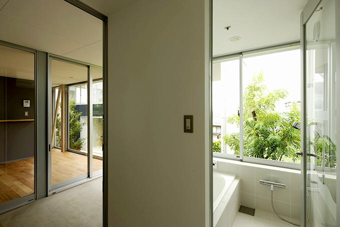 1階がリビング、2階に個室と水回りという配置のこのお宅。寝室からテラスを挟んで洗面、浴室があります。この配置から、食事を終えて、2階に移動し、入浴後、すぐに寝る。なんて動きが見えてきますね。またテラスを挟んでいることで浴室のプライベート感も増して、外の緑をゆっくり楽しめそうです。