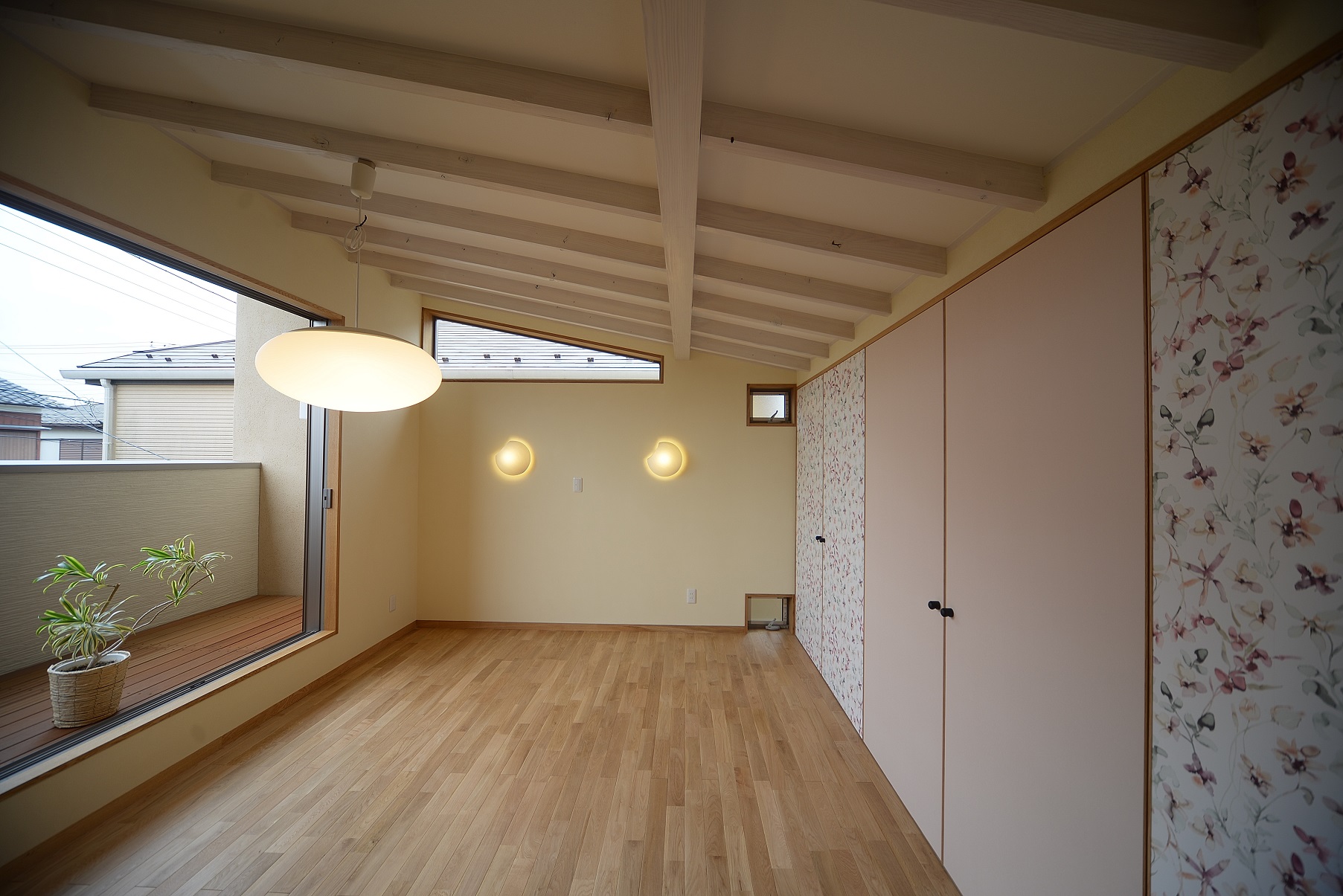 天井を現しにしたら、屋根の断熱が少し心配になりますね。でも安心です。自然素材のセルロースファイバーで、屋根断熱もバッチリ。しかも防音効果もあるそうで、寝室への採用条件としてもピッタリですね。また、冬でも日が差し込むような設計になっているので午後まで日の光で暖かく過ごせるようです。