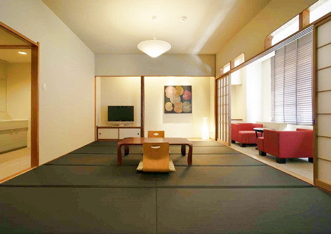 こちらは障子に床の間もある、旅館の純和風客室の間取りながら、思い切った色使いの変更でスタイリッシュな空間に舵を切ったお部屋です。なんと畳をへりもい草も真っ黒に。ですが微妙な凹凸による光の乱反射により、カーペットやタイルの黒よりもどこか温かみのある床面に仕上がっています。また、絵画とソファ以外の色調を押さえることでアクセントがついているのもポイント。和室を作りたいけど他の部屋との調和に悩む方は、柔軟な色使いを参考にしてみては。
