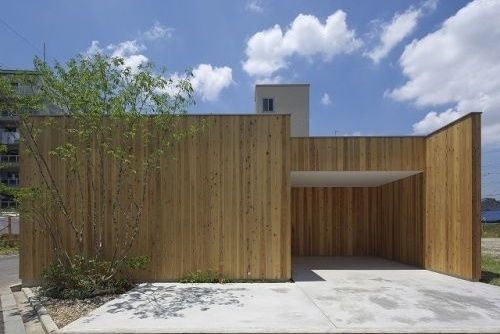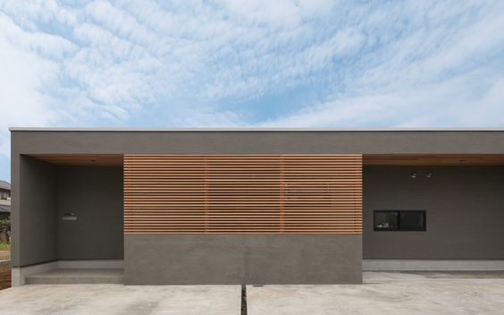 外壁の色合いに落ち着きと自然な風合いを感じます。中心にある木目調のルーバーが水平に伸びる建物をよりすっきり見せています。ルーバーはこの裏にある玄関ドアの目隠しとなっています。夏、玄関のドアを開けて風を通したい時に役立ちます。機能性を兼ね備えた美しいデザインです。