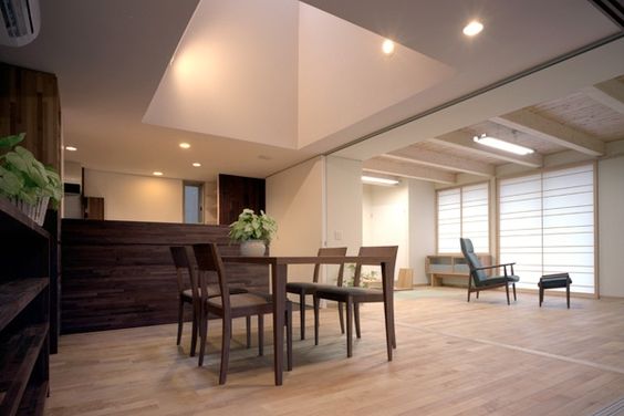 無垢材と漆喰をふんだんに使った、自然素材に囲まれて暮らせる住まいです。ダイニングの天井には、やさしい月明かりが射しこむトップライトがあります。平屋では二階がない分、比較的場所を選ばずトップライトを設置することができます。この住まいもそのメリットを生かしています。