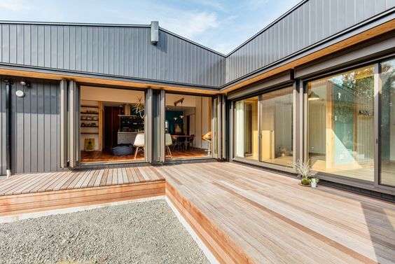 モダンで美しい板張りの平屋です。囲まれ感のある建物からは想像できないほど、室内は明るく開放的です。その理由は、この板張りの壁と居室の間に、緑溢れる庭が配置され、その上部から太陽の光が降り注いでいるからです。