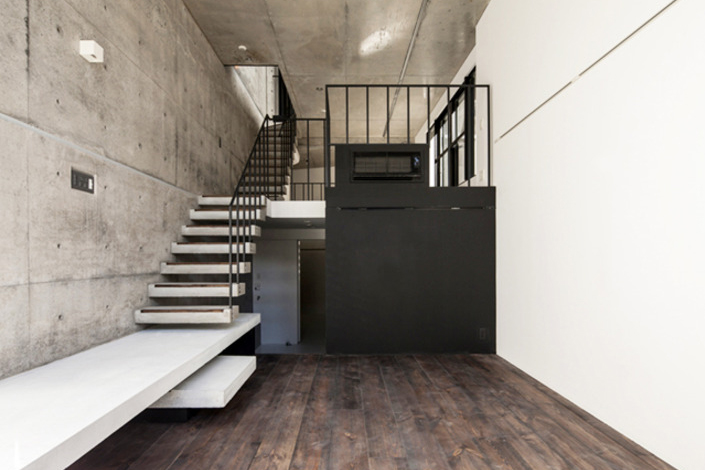こちらのリビングは、なんと、4.5畳!驚きの狭小っぷりです。ですが、スキップフロアにしてさらに、その階段と天井を躯体現しにすることによって天井高を確保し、開放感を表現することに成功しています。そしてスキップフロアの高低差を40cmと少し低めに設定してベンチの役割もこなします。また上部が浮き床のようになっていて視線の抜けだけでなく換気機能までもこなしているのです。