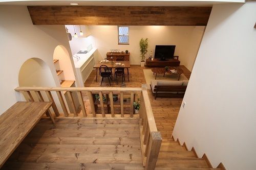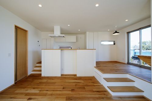 LDKの中でダイニングキッチンの床を50cm高いスキップフロアにしているこちらの住宅。空間としてのつながりは保ちながら、リビングとダイニングキッチンを緩やかに区切ることに成功しています。それぞれのスペースの役割をはっきりさせることで、何だか部屋数が増えたようなお得感もありますよね。なお、スキップフロアにする分、天井は通常より高く設計しています。
