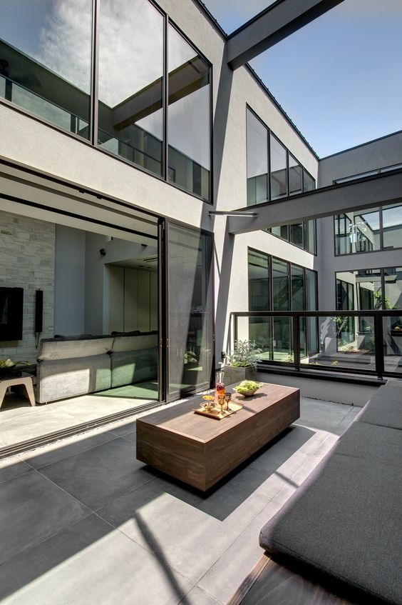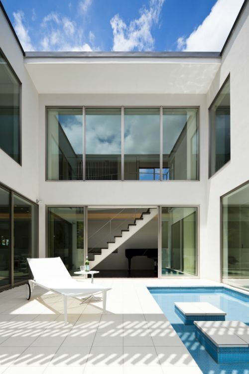 中庭の白いタイルと水盤が日の光で眩しく輝くリゾート風コートハウスです。この美しいテラスには柱のない大開口窓でつながった、グランドピアノのある吹き抜けリビングがあります。モダンでスクエアな印象の外観同様、インテリアもモダンに仕上げられています。壁に囲まれることで外部と明確に仕切られたこの空間はちょっと別世界ですね。