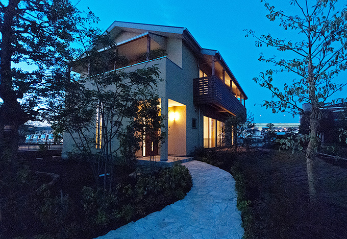 夜になると神秘的な様相を見せてくれるアプローチ。直線を組み合わせたすっきりとしたラインがモダンでありながら落ち着いた雰囲気を醸し出します。ライトアップされた植栽が建物に葉影を映し、ラグジュアリーな空間になりました。