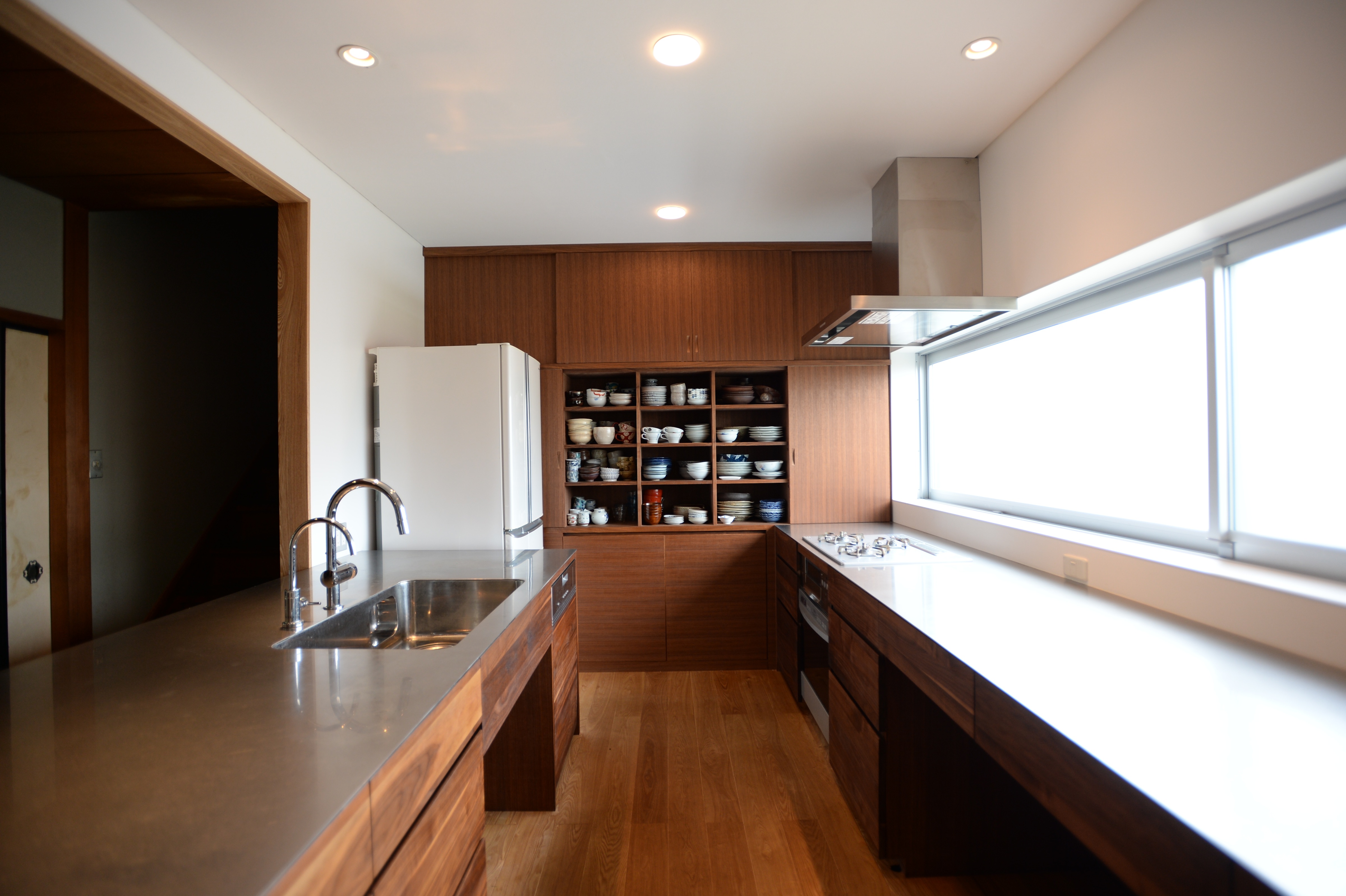 限られた面積の中でキッチンとダイニングをひとつの部屋にしたいお宅や、火や水をダイニング側に向けたくないお宅におススメです。窓から美しい景色が見えるお宅なら楽しくお料理ができそうですね。キッチンが丸見えなのが気になるという場合には、ダイニング側に目隠しと配膳を兼ねたカウンターを配して視線を遮るなど、広さにゆとりがあればプランは色々と考えらえます。自由度の高い形のキッチンです。