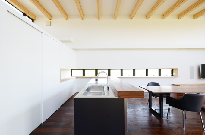 天井の木が作るラインに並ぶかのように設置された横長のアイランドキッチン。ダイニングテーブルに向かって取り付けられた木のテーブル板が、作りたての食事や、淹れたてのお茶を運ぶ中間点の役割をしてくれそう。また、スツールを置けば コーヒーブレイクで一息つく、お家にいながらおしゃれなカフェにいるかのような気分にしてくれそうな空間。スッキリしたこの空間には、食事を作った時に出るゴミなどもそのままにせず、すぐに片付けたくなりますね。