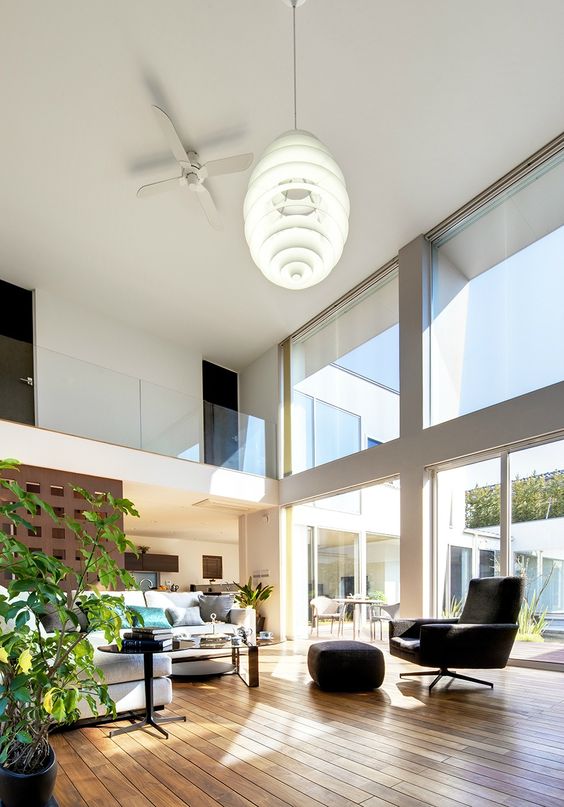 中庭からの風と光が差し込む、吹き抜けのリビング