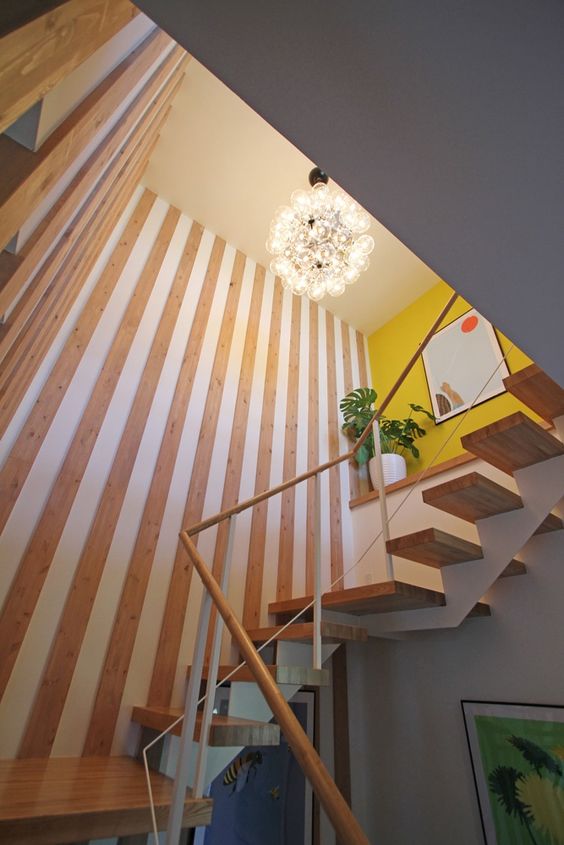 空間を開放的に見せる吹き抜けですが、床面積が減るため二の足を踏む人も多いもの。その場合は階段のみを吹き抜けにすれば、削られるスペースは最小限に、吹き抜けの恩恵は最大限に享受することができます。階段の途中や踊り場に高窓を設ければ採光もバッチリで、下の階まで光が届きます。